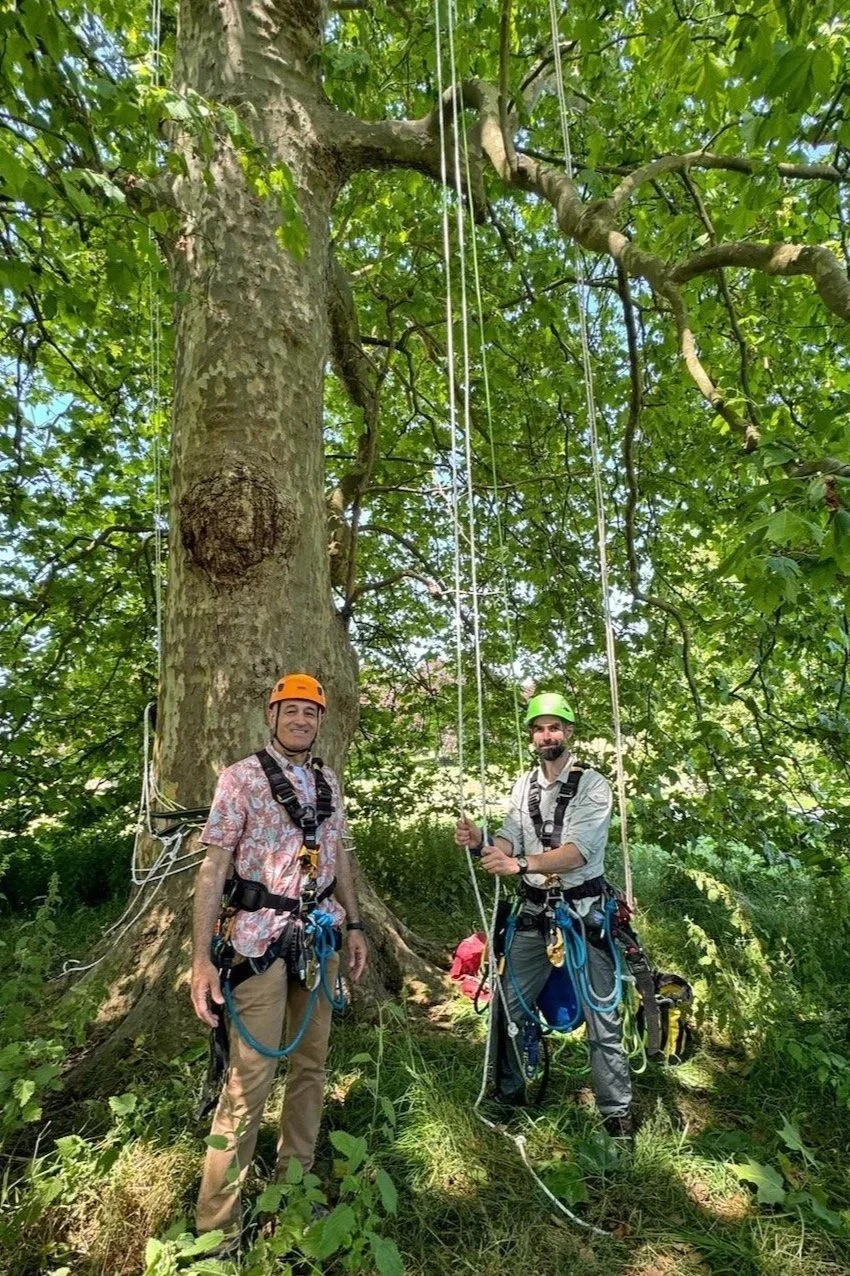 Renowned as a theoretical physicist, author and broadcaster, Jim was very cool, presenting whilst perched on a big bough high up in the twisting, leafy architecture of an Oriental Plane tree canopy. Health & Safety is a key component to our work. As a Tree Safety Expert, my job is fully focussed on the client, ensuring presenters are safe as they deliver their pieces to cameras in some complex and interesting environments.